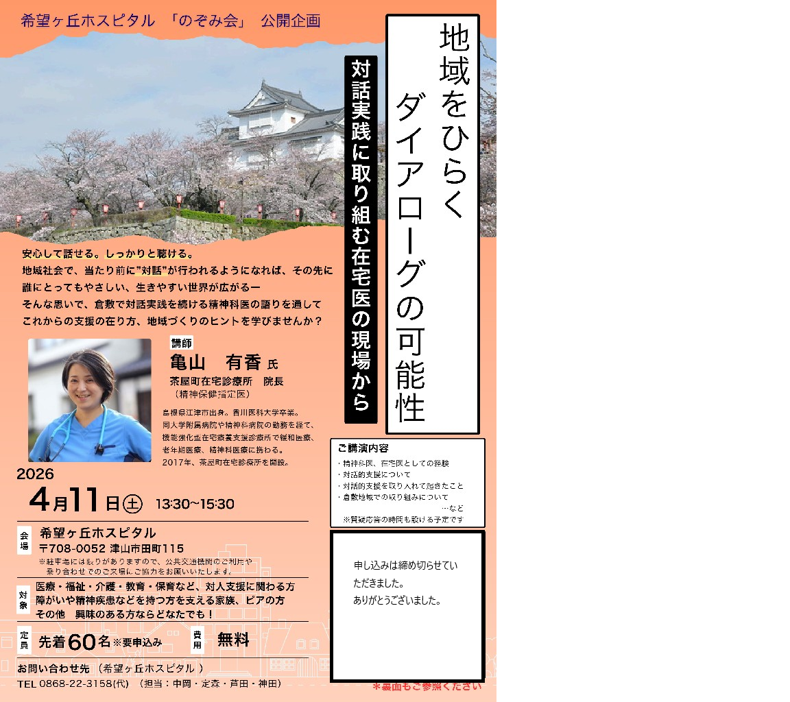 当院で開催している家族会「のぞみ会」の公開企画を下記の通り開催いたします。